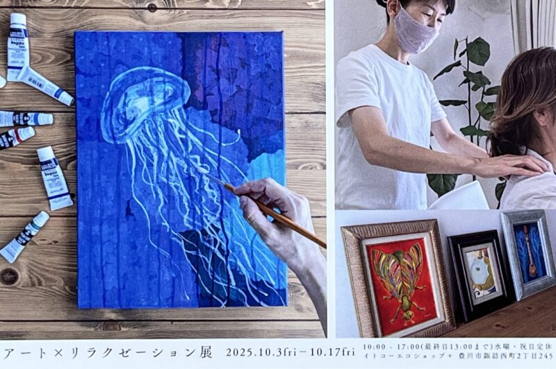 新しい企画展が始まりました。 「アート×リラクゼーション展」海をゆらゆら動くクラゲや木の葉や木の実といった自然の物から …