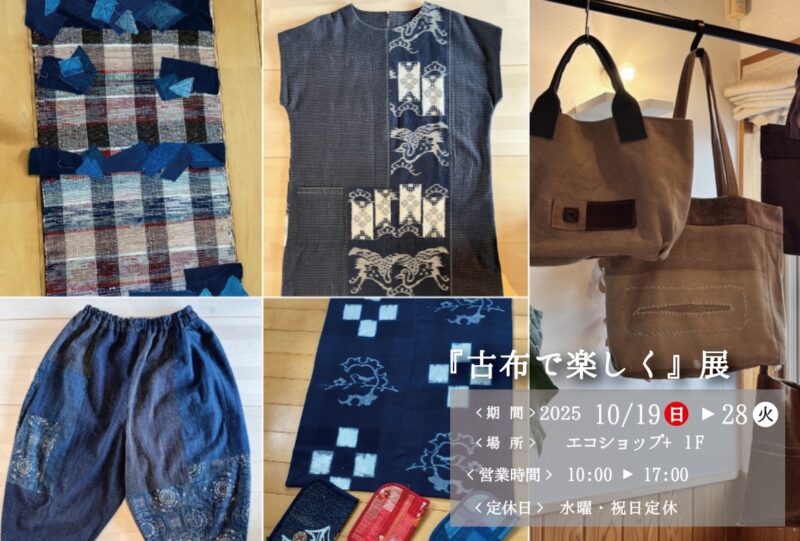企画展「古布で楽しく」展がはじまりました。絵絣の服、タペストリー酒ぶくろのバックに、古布のパッチワークのパンツなどなど古…