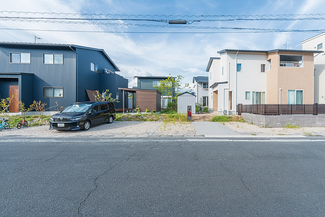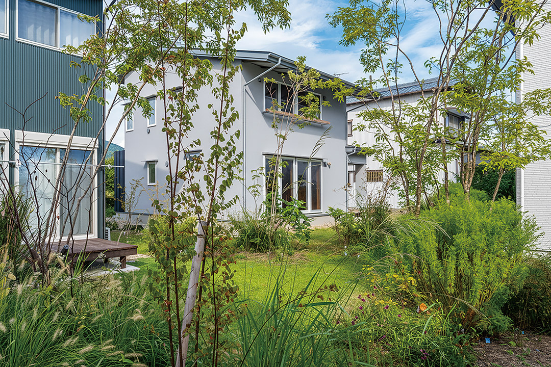 4棟のイトコーの家が建ち並ぶ、街中の緑豊かな分譲地に建っている家