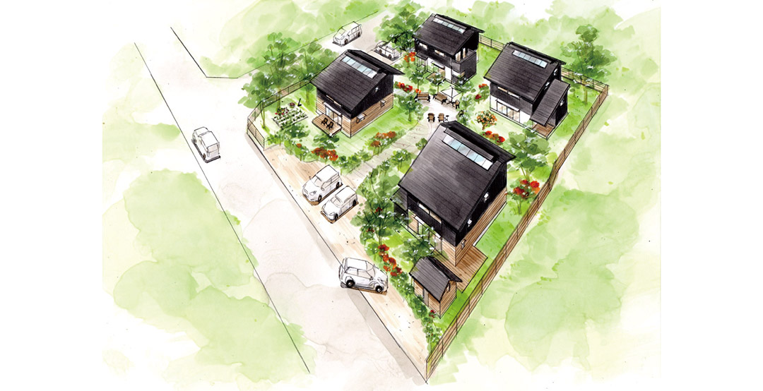 「こくらす*ふそうのもり」は、4棟のイトコー家が建ち並ぶ環境共生型分譲地。定期借地を活用して、便利な場所でありながら金銭的な負担を抑えた生活を実現しています。「自然とともに愉しく健康的に暮らす」というイトコーの価値観に共感する住まい手が集うこの小さなコミュニティは、コンセプトハウス以外の3棟は既に入居済みです。