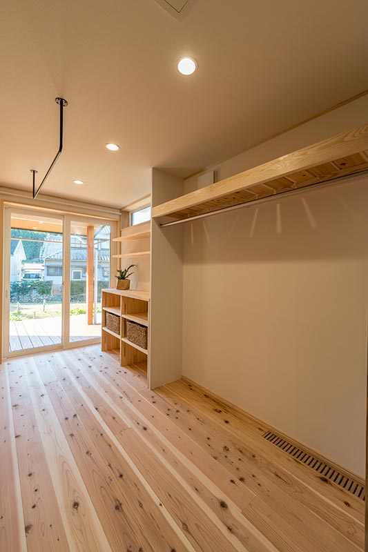 ウォークインクローゼット。干し竿はご夫婦の希望でアイアン素材のものを採用している