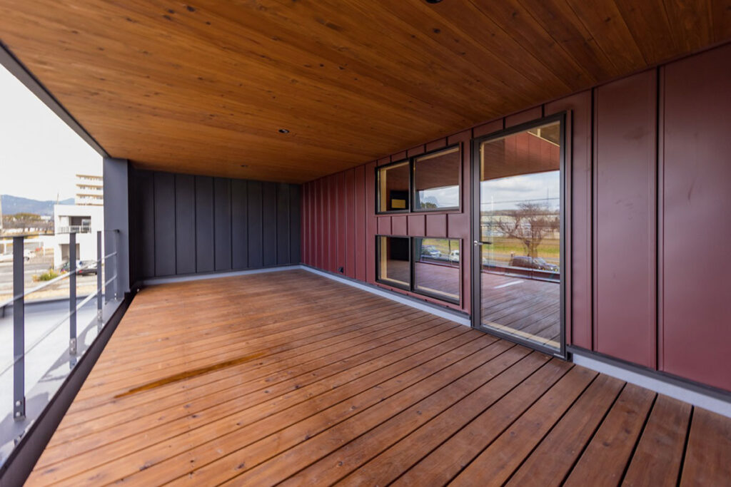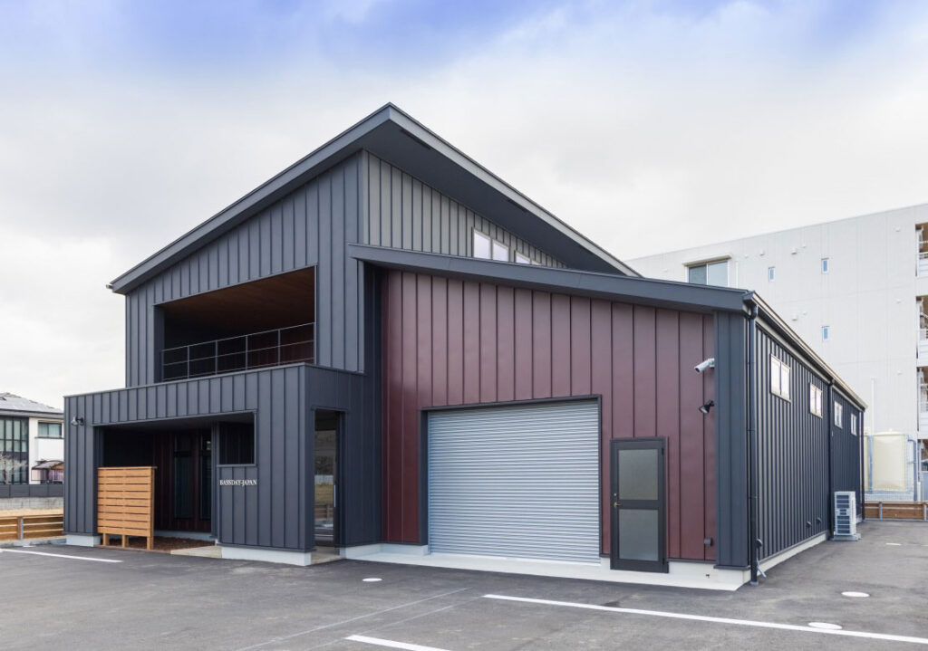 佐奈川沿いにある、黒を基調としたモダンな建物。