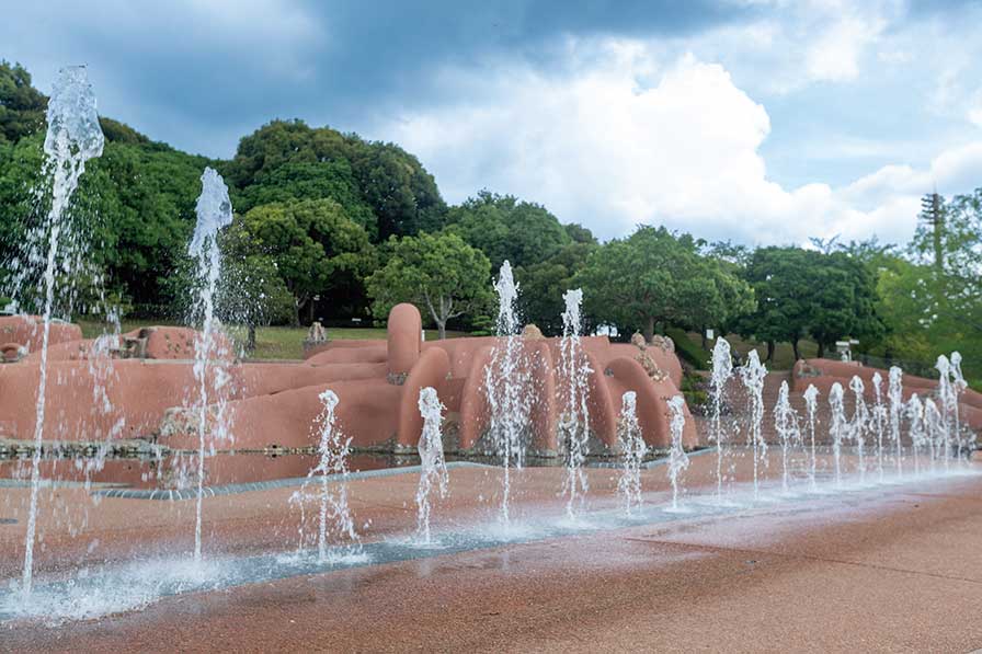 赤塚山公園の大人気スポット「水の広場」。リニューアルし、新しい噴水や噴水のイルミネーションなども。夏になると子ども達で大賑わい。