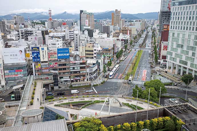 客室からは、豊橋の路面電車を一望することができます。駅前大通の一本の道は、圧巻です。