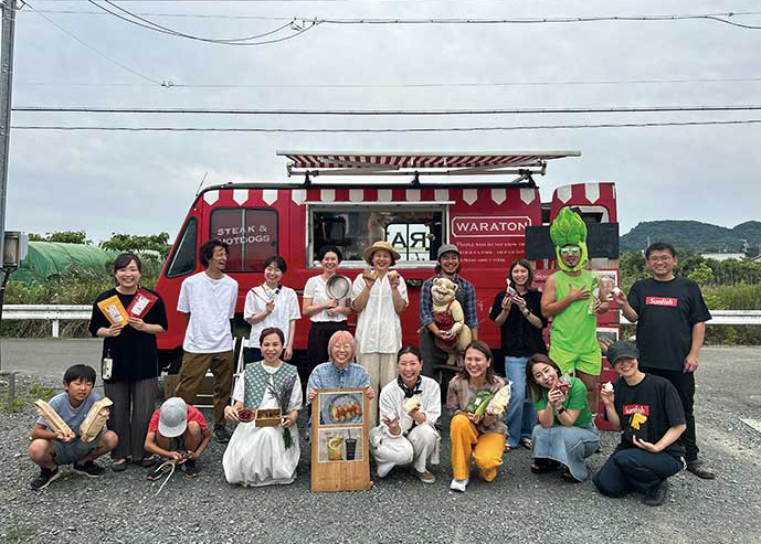 マルシェで出店した際の一コマ。キッチンカー、手作りお菓子屋、地元農家さんが作った野菜が並び、人との繋がりも感じられる!