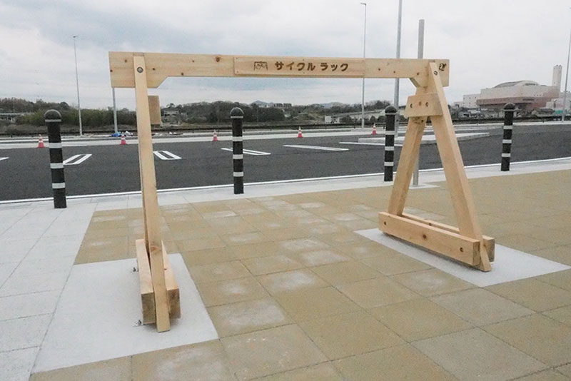道の駅とよはしや、公共施設、コンビニなどにある東三河の認証材を使用した木のサイクルラック。