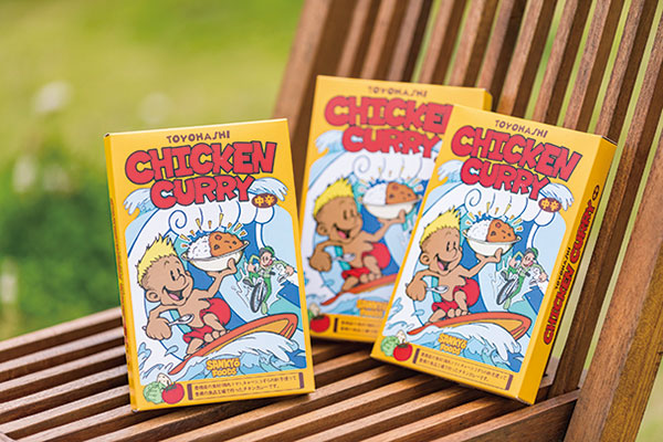 サーフィンや自転車がデザインされたチキンカレー。豊橋産のトマト、キャベツ、うずらの卵の食材を使用しているため、体験後のお土産にぴったり。(道の駅とよはしにて販売)